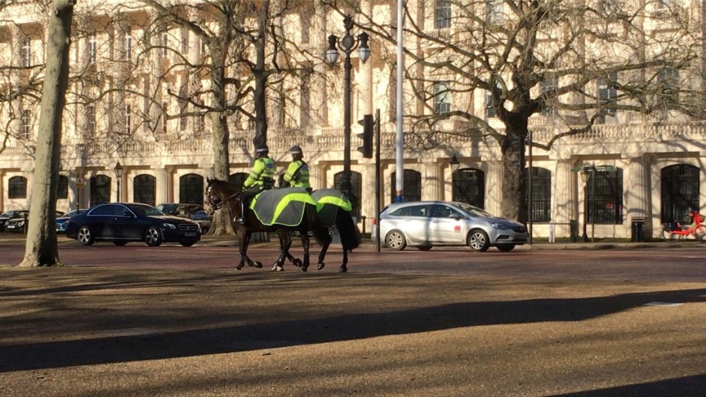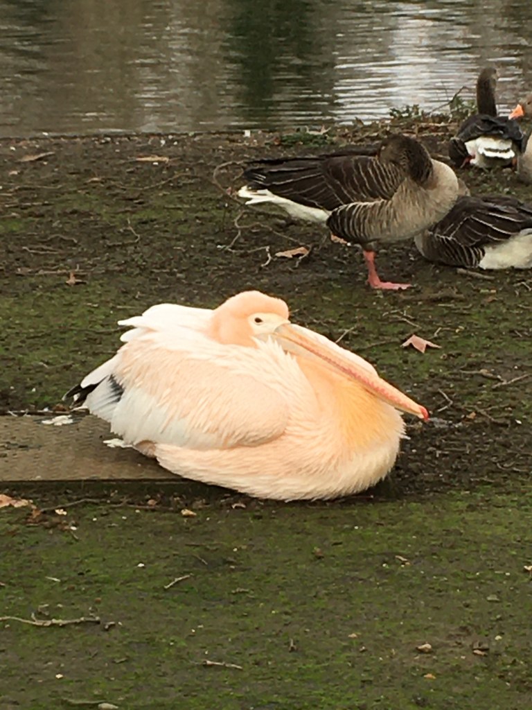 Our walks in St. James’s Park are regularly punctuated by stops to admire the six pelicans who usually spend their time on the paths where walkers gasp to see the bird with the second-largest wing span in the world strolling companionably beside them. Sometimes, for a change, one of them will Clamber up onto a bench to sit nonchalantly next to a nervous admirer. And on days when they are not feeling gregarious, they may all make do with sunning themselves on their rock in the middle of the lake.
