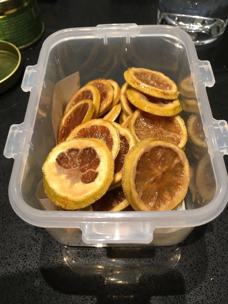 I had a few rock hard lemons left over and was delighted to find a recipe for “candying” – “for use as snacks or cake decoration” the recipe said.. Well, let me tell you, you’d only snack on them or put them near a cake if you had a dentist in the family – preferably living in the same house, preferably in the same room. “The writer” is always very gallant about my culinary efforts but even he could only manage “Well the middle’s are very nice.” So the only thing they’ll be decorating is the bin.