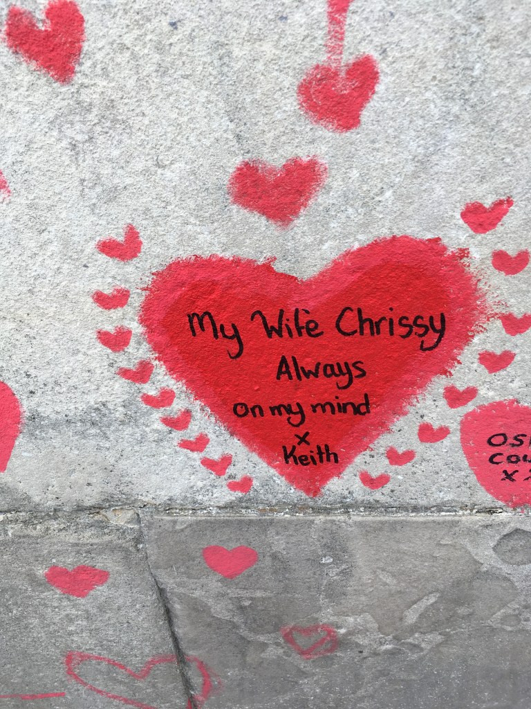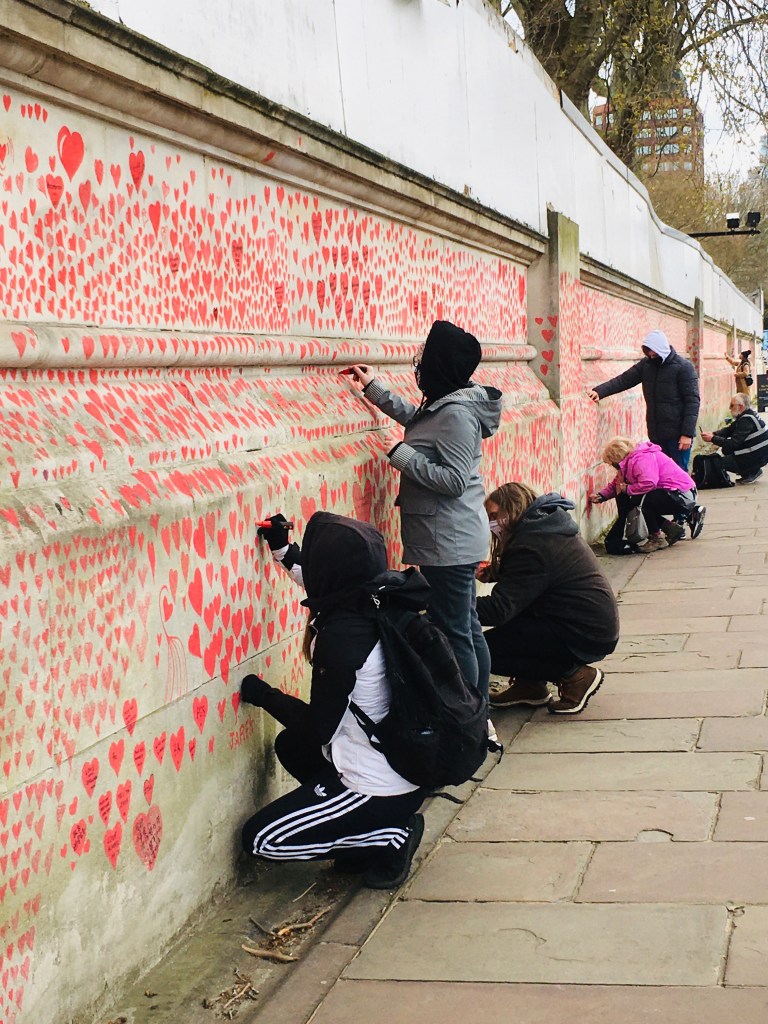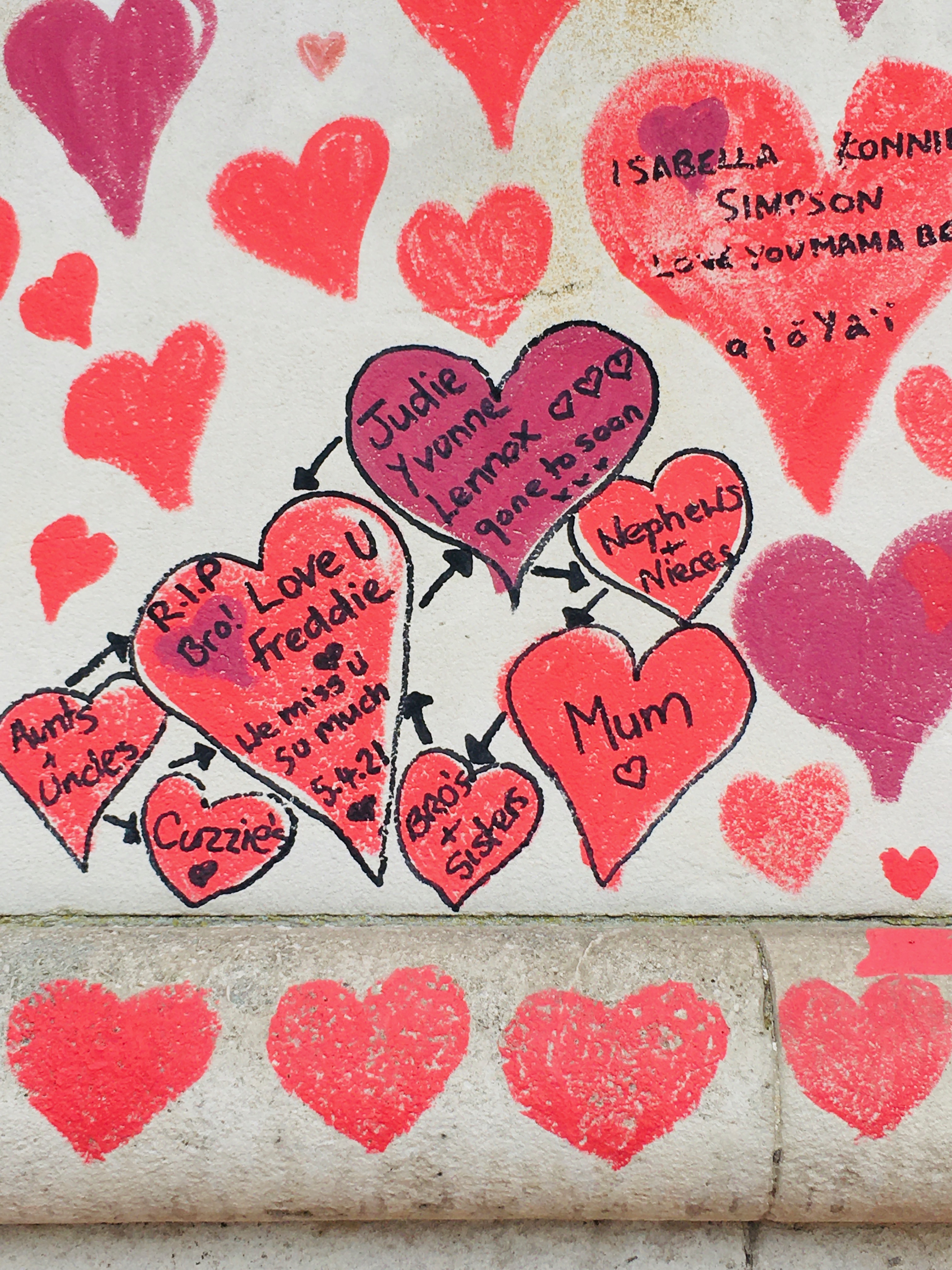 Our walk today took us to the Covid Memorial Wall started by bereaved family and friends of Covid-19 victims and featuring 150,000 hand-painted red hearts – roughly one for everyone in Britain who has died so far. The wall is the work of the Bereaved Families for Justice who are calling for a statutory enquiry into the government’s handling of the pandemic and who have chosen this spot because it faces the Houses of Parliament and can be seen by any politician glancing out of the window in the hope of spotting impending signs of Spring . As such, the wall is, of course, a political statement. But when you see the bereaved crouching on the ground or standing on tip-toe on trestles, deep in concentration as they fill in the names of their lost loved ones, you realise this statement has taken on a role far more important than that.