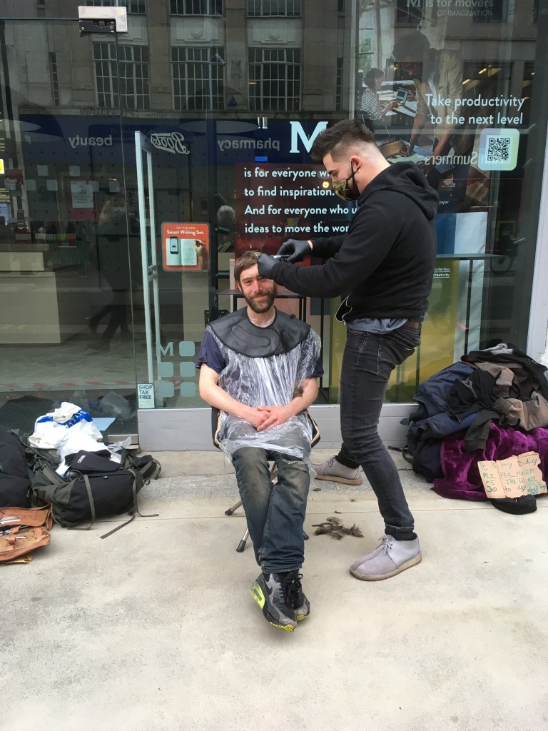 “The Writer” was aghast. “I think he was homeless and the barber, who is a professional, was walking past with his hairdressing kit and kindly offered him a sprucing -up birthday haircut” or “The barber is homeless and the barbee is a wealthy businessman who said, “Since today’s my birthday and you’re obviously a bit short of cash. I’ll give you some work. You can cut my hair and I’ll pay you handsomely for it”.