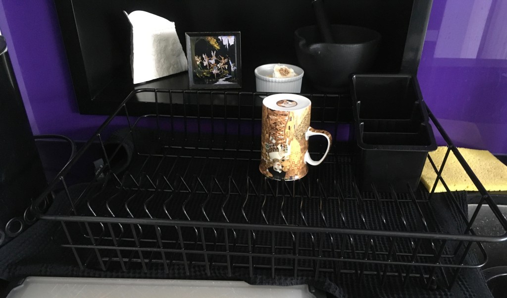 This morning, I unwrap an black washing up bowl and a black dish drainer, the smartest I could find to ornament our newish kitchen, and, after breakfast, I am astounded when “The Writer” leaps to the sink, flourishing a tea towel and commanding, “Leave it to me”!