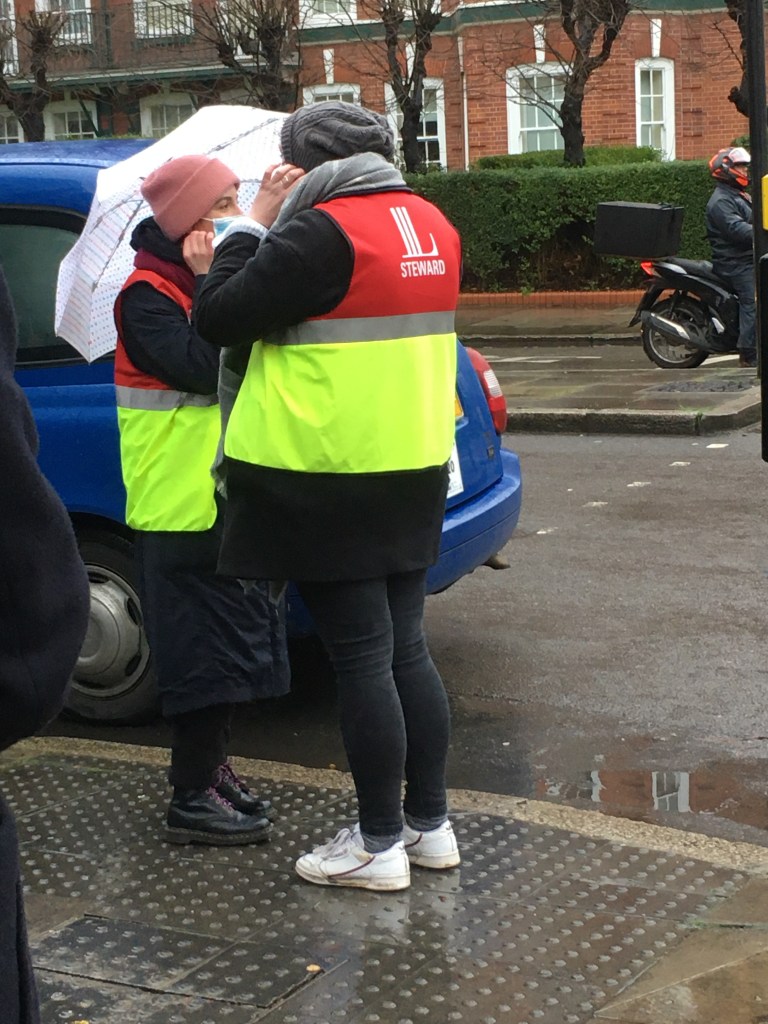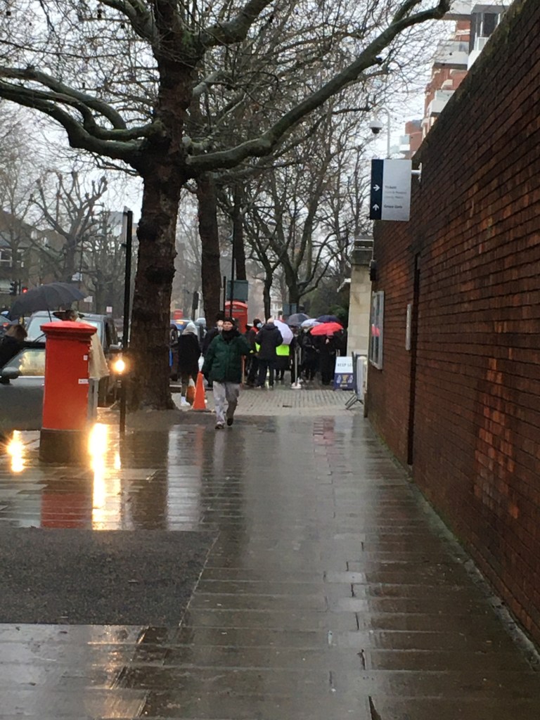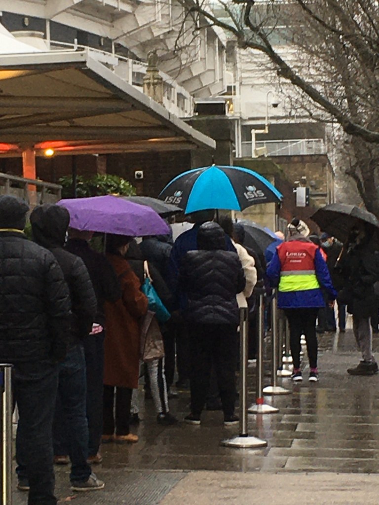 As we draw nearer, we see the queue snaking round the building with no end in sight. We tell one of the stewards we have an appointment. He apologises with charm and tells us to join the queue.