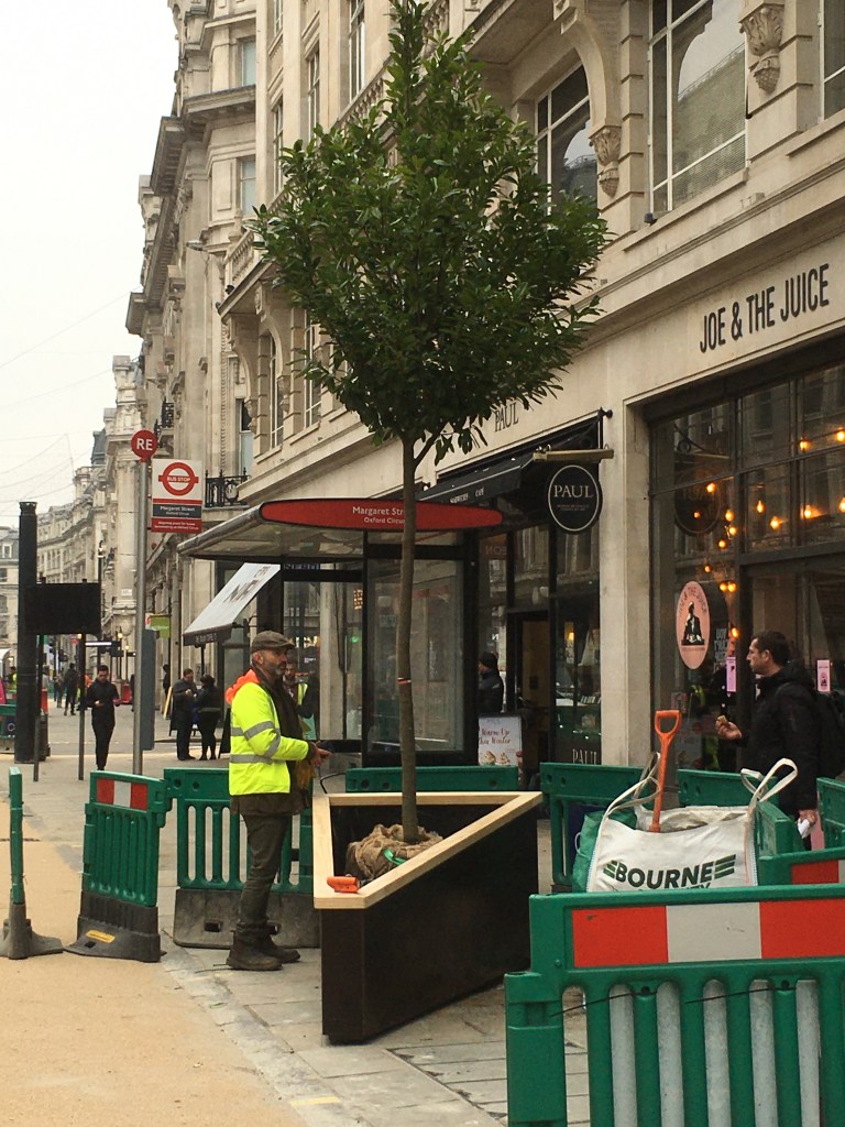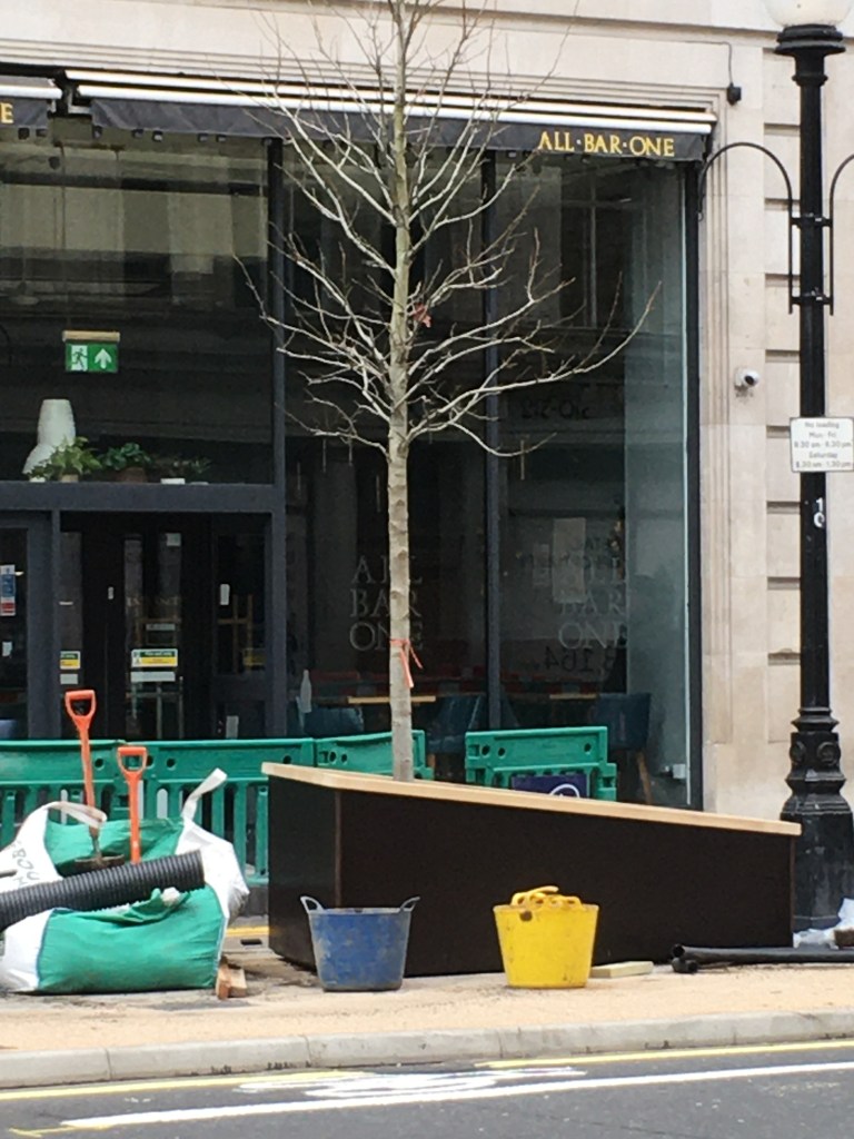 He told me that trees are being planted the length of Regent St. by The Crown Estate “as a response to Covid -19” They are an 18-month experiment in helping to improve air quality and boost biodiversity. Each planter will be filled with flowers, seating will be built in and, eventually, there will be artwork on the pavement around each tree.