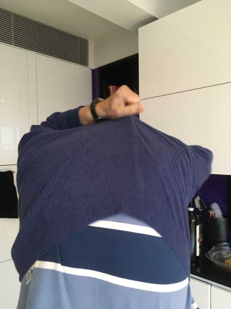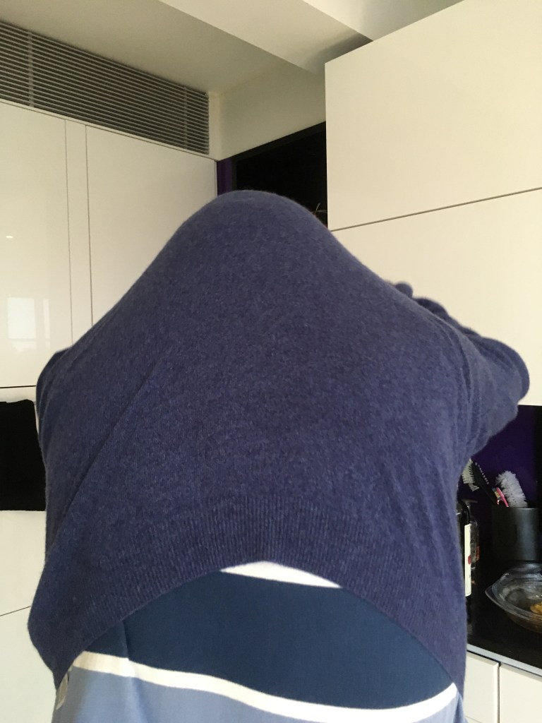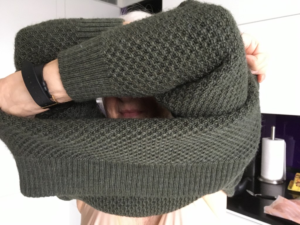 3. Just before the sweater reaches the head, exit the sleeves, one at a time, to make head-clearance smoother.