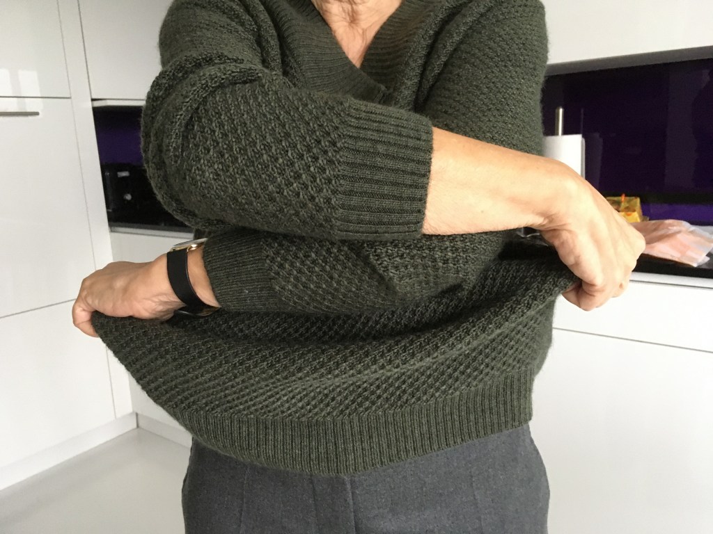 1.Cross arms in front and, with arms still crossed, place each hand just below the middle of the sweater and gently take hold of a handful of fabric on each side.