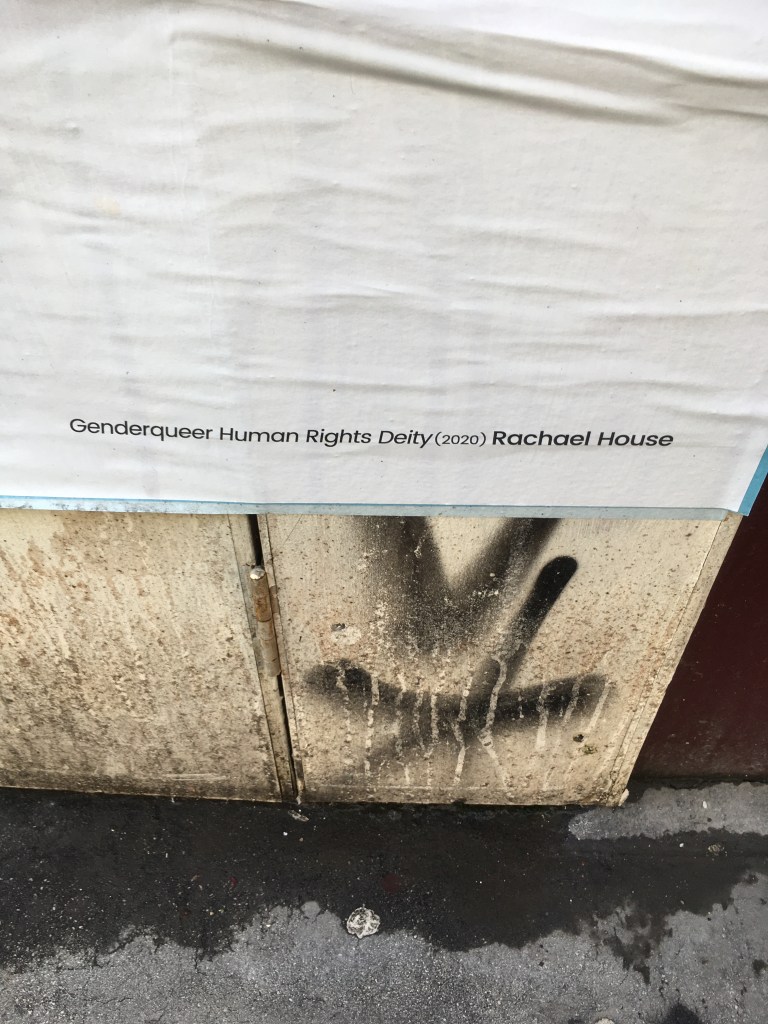 Back home, I looked up “The Gender Queer Human Rights Deity” and discovered that the drawing was by an artist called Rachel House and was her first poster for “Flying Leaps” a collection of artists whose aims are to” Exhibit artists’ work on street poster sites to make unexpected, thought-provoking contributions to the urban spectacle“.