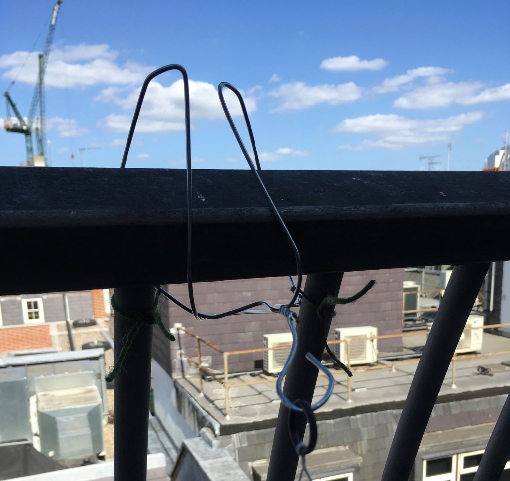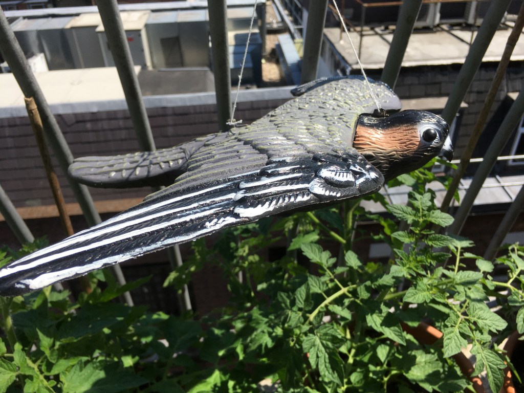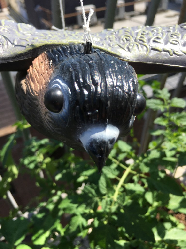 Harriet arrived yesterday- two grotty pieces of plastic that wouldn’t fool a pet budgerigar, let alone a feral pigeon, we thought. “The writer” jammed the wings onto the body , then removed them and jammed them on the right way round with the crudely painted feathers on the top. We were then presented with the dilemma of where and how to hang it. It has to move, apparently, as a plastic hawk, stationary over a load of tomato plants for six months seemingly fools no-one.