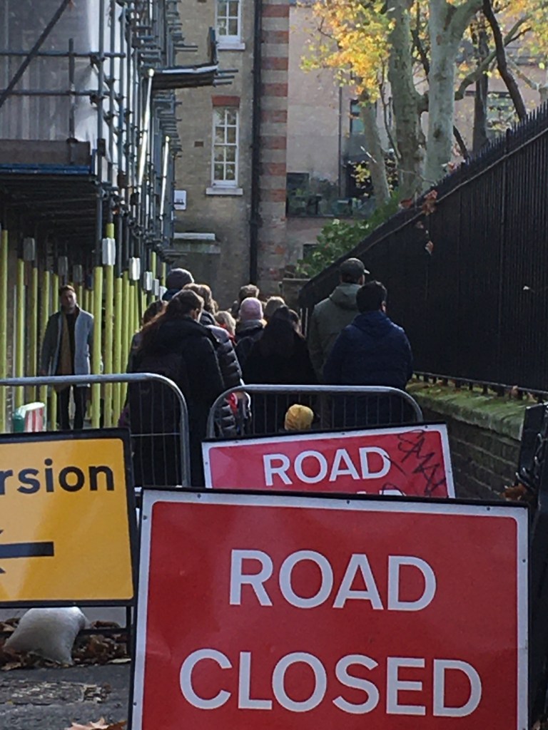 As we draw nearer, we see the queue snaking round the building with no end in sight. We tell one of the stewards we have an appointment. He apologises with charm and tells us to join the queue.