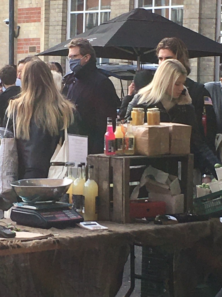 This morning turned out to be a thrilling exception. We decided we’d walk in Marylenone for a change, neither of us being in the mood to commune with nature in a park. We left a dismal, deserted Soho and, behold, as we approached Marylebone High St. ,we were transported to a different world. People scurried along the streets, Crowds queued outside Waitrose – apparently open long before Sunday’s legal 12pm. More crowds queued outside the Ginger Pig butcher, whose huge sausage rolls my husband has been known to buy when supposedly out shopping for groceries, and sit munching in the nearby little park, pubs were open, serving beer to drink on the pavement.We gazed around us as though woken from a dream It was then we came upon the largest queue of all. It snaked round the block and down the road and ended in a Farmer’s Market that used to take place every Sunday in a large car park now too valuable for cars or markets and currently the foundation for a vast block of luxury flats.