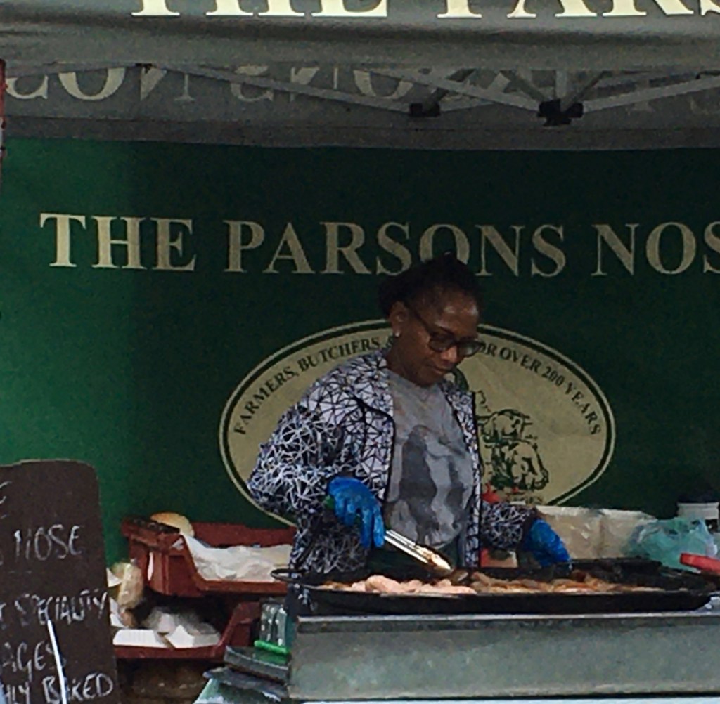 And so, we peer into every stall, inching our way down the street, like detectives seeking a fugitive – until we reach the last one where all his prognostications are justified. We smell it before we see it, The Parson’s Nose, serving fragrant sausages, succulent hamburgers and glistening fried onions, all nestled in soft, white, pillowy rolls. We eat them leaning on some scaffolding with a pile of cladding for a table.