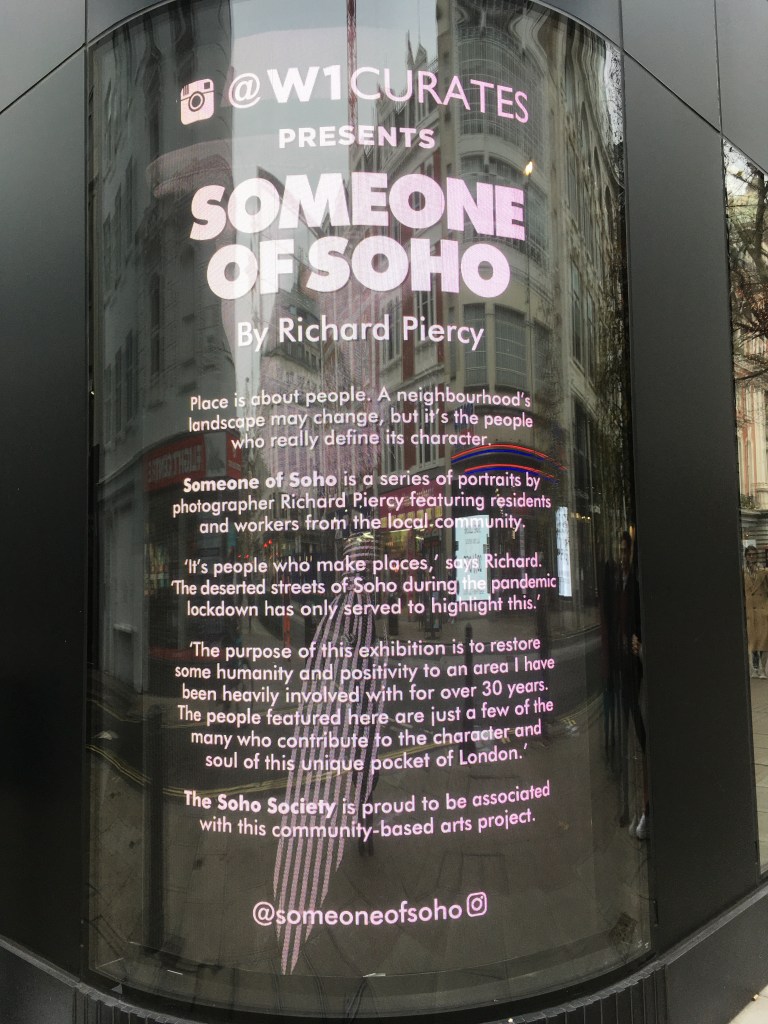 In my post of June 11th, when London was like a ghost town under complete Lockdown, I featured the dramatic and perceptive portraits of Soho residents and workers by photographer, Richard Piercy, in his Someone oF Soho Exhibition, shown on the sadly boarded up- restaurants of Soho.