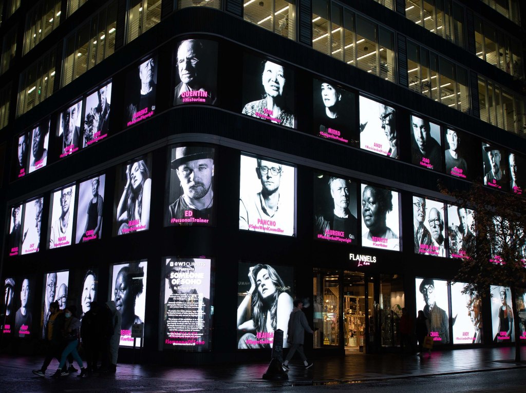 Today, walking down Oxford St., I was confronted, once again, by his portrayals of our neighbours and friends on the video wall of the clothing store Flannels, at number 161-167 Oxford St..