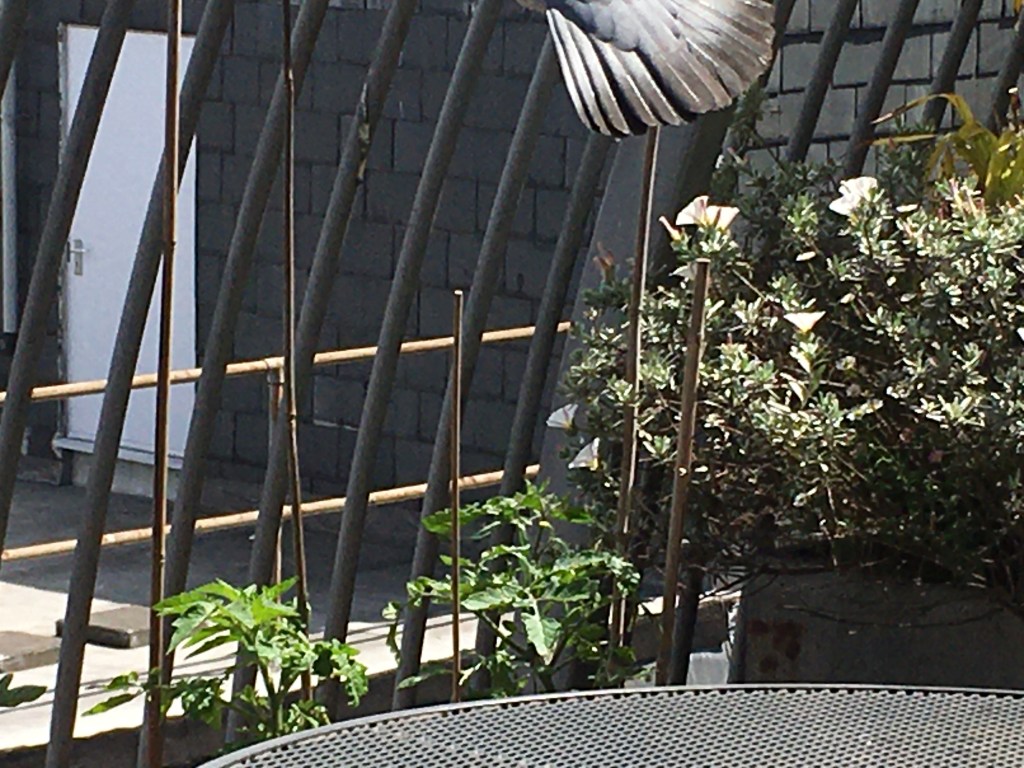 Reckoning it’s safe for him to drop in to our place for a meal without enduring the agony of encountering the lovers, he descends onto our terrace.