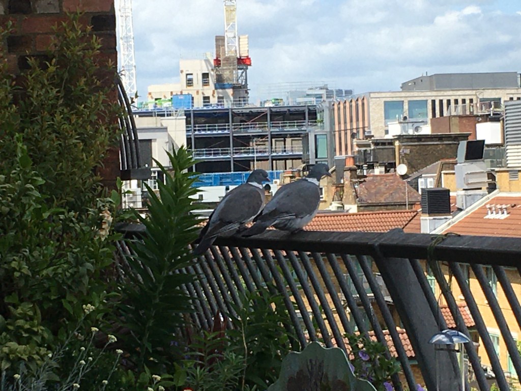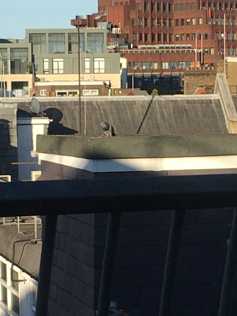 Despite having wound them them in this intricate narrative, “The Writer” is still determined to prevent the birds from visiting and continues to keep watch. Friday, gives way to Saturday and the pigeons become more adventurous as the builders’ din dies down. On Sunday, we watch their lumbering take-off as they obviously feel the time has come for them to leave their roof and venture further afield.