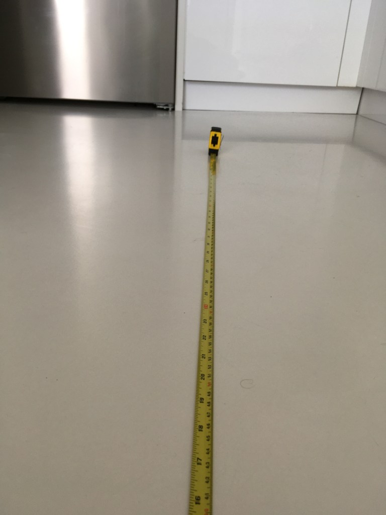 We drag the table back and forth until we both lose our temper. At this point, I find a tape measure and hurl it onto the ground.